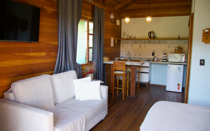 Assim, os hóspedes podem apreciar um chalé em madeira, com sanefa (um tipo de bandô) pintada a mão, com pintura bauernmalerei, considerada a técnica de pintura afetiva, honrando os antepassados e suas habilidades.